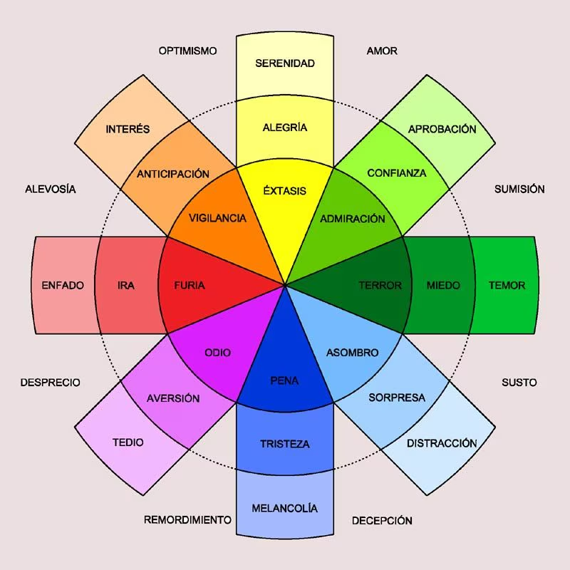 Esta rueda permite explorar todas las variaciones y matices de lo que sentimos, desde lo más general hasta lo más específico. Fue creada por Robert Plutchik, psicólogo, en 1980, según el cual había 8 emociones de base : la alegría, el miedo, el asco, la ira, la tristeza, la sorpresa, la confianza y la anticipación. Una idea que conecta con la teoría de Ekman : las emociones complejas no son más que una mezcla de emociones simples.