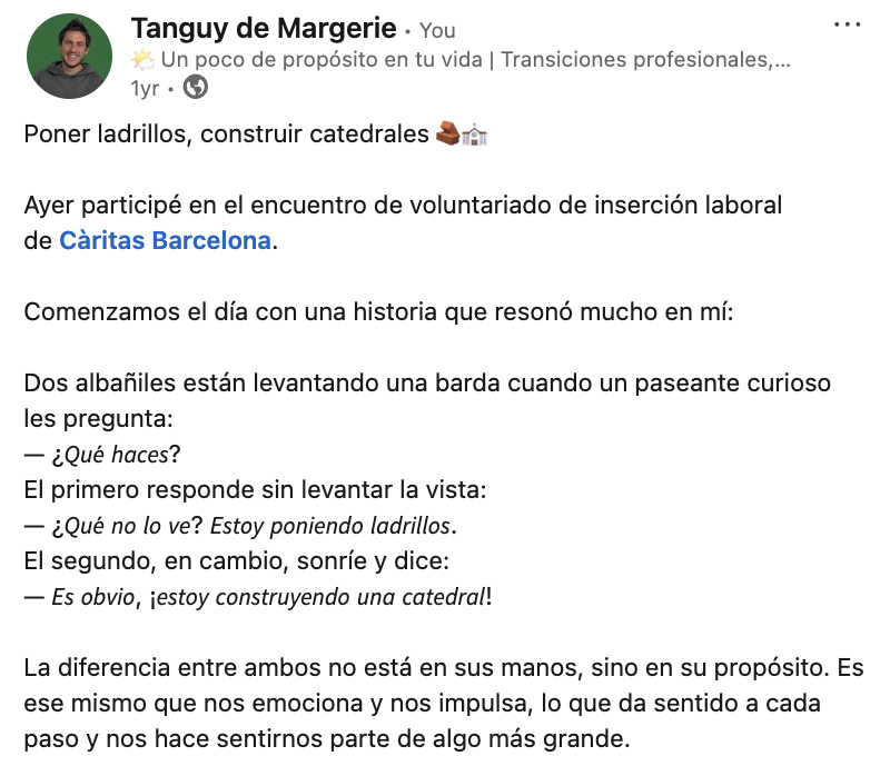 PD: escribiendo la conclusión me hizo pensar en un día de voluntarios de Caritas al cual participé la ultima vez… Me gustó esta fabula de los albañiles…